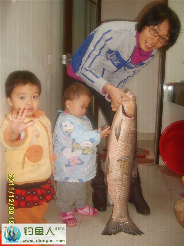 12月10日,和朋友约好一起去的。早上4点半就到钓点了,月亮很圆很红,很漂亮,整个江面的水都给染红了,气温比较低,但没风,看似非常美好的一天,但不见朋友的踪影,不罗嗦,捉紧时间下杆,期待更好的收获。下好杆之后给朋友电话,他个XX还在床上睡觉,真是X他大娘的。大概是5点过一点他就到了,他开饵,我继续等大鱼上钩。大概5点25分,铃铛作响,动作不大,但可以判断这是青鱼在咬钩,我稍等片刻,提杆,中鱼,又是中大青的感觉,但明显感觉力道没昨天那条大,往后退几步直接摇轮子收线,很快,大青就给拖出水面,由于当时天还很黑,大青见到灯光直接往外窜,鱼尾巴溅起很大的浪花,要了好几米线,于是溜了一会,这时鱼的力气锐减,我趁机收线,把鱼拖会岸边,我朋友早已准备好抄网在岸边了。几分钟的搏斗厮杀,最后大青乖乖入网,此鱼目测大概15斤左右,长约一米。至此,水面恢复平静,由于当时天很黑,没办法拍照。所有照片都是回家再拍的。6点多,天刚刚开始亮,随后太阳也出来了,给我驱赶了不少寒意,感觉多么美好的一天。