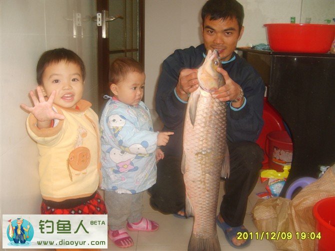 他收拾好东西我也开好饵了,下杆,(9根海杆都抛在不到7米宽的水面)。耐心等待铃铛作响。结果第一次饵到时间就换,铃铛响都没响过。这时,时间已是下午两点多了,第二趟饵下水,依然耐心等鱼上钩。第二趟饵铃铛也没响过。第三趟饵下去,没过几分钟,其中一根杆铃铛作响,但忽然停了下来,我抬头一看,只见那根杆的鱼线越来越松,我想肯定中鱼了,我跑过去一提,感觉像挂底了,基本拉不动,但我知道这是中大青的感觉,突然水底的鱼开始发力,拉得我往前走了几步,轮子吱吱作响,一下要去了10多米的线,我也不敢怠慢,赶紧往后退了好几步,趁鱼喘息的机会赶紧收线,不到10秒的时间大青基本给拖上水面了,只见水面的白条乱窜,但还没看到鱼有多大,但这鱼的力度非常的大。这时大青又忽然发力,轮子又吱吱作响,又要了好几米的线,还好我早有准备,这次不至于给它拖我往前走几步。大青做了这次冲击之后感觉它的力度变小了,我赶紧收线,终于看到大青的头露出水面了,有点失望,个头不大,当时估计是10到11斤这样子。而且有三个鱼钩分别钩在鱼嘴巴,这下我就不管那么多了,狂收线,把鱼硬拽到离岸边一米的位置,朋友已经准备好抄网抄它了,谁知鱼刚碰到抄网又再次发力作最后一次挣扎,往左边狂窜,横扫旁边三支海竿,冲到岸边搁浅了。我朋友眼疾手快,用抄网扑过去。。。。。。我当时就说:别!!这样扑法,等下鱼钩会钩到抄网。。。。。。我话还没诶说完他已经扑下去了,还不幸言中,鱼钩真的挂抄网了,鱼抄不进去。还好这时的鱼已经没什么力量再去做反抗了,还好另外一个钓友够猛,他抢过抄网,按住鱼,然后用手直接把鱼按进抄网。到此时,一个悬挂的心终于放下来了。(用时不到五分钟)平生第一次钓到青鱼,也是第一次钓到那么大的,心里有说不出的开心与激动。当我捧起鱼正在拍照的时候其中一个铃铛响的很凶猛,估计是大物,我赶紧把鱼扔一旁,赶紧去提杆,鱼个头不小,估计是鲤鱼,大概5到6斤这样子,但因为之前起那条青鱼把几根杆都混在一起打架了,鱼线给缠绕在一起,收不了线,最后给跑了。心里想,跑就跑吧,我那还有条大青呢。至此12月9日就基本完毕了,期间上了鲮鱼、鳊鱼等,但都不大。