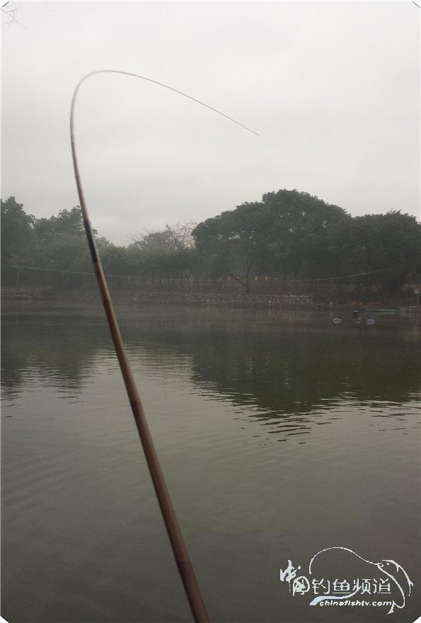 天气冷,水面一层热气貌似薄雾,中间停了一阵口,浮漂慢慢的上升慢慢的下降,又是虾在闹了,突然浮漂一个有力的下降,中了,看看竿子的弧度
