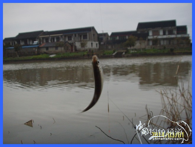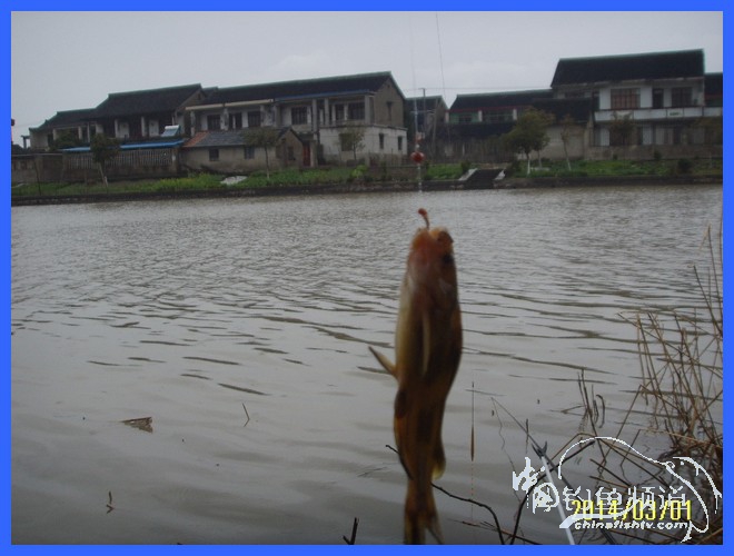 5点钟时,总算看到漂晃了一下,然后上顶了半目,很象鱼口,怎么能放过,轻抖竿,中鱼,但力道太小,一下就飞出水,是一条大拇指大小的黄颡,晕 啊,大河的经验,先钓这个鱼往往意味着鱼少,看来今天希望不大了。下午的水体明显感到比早上要冷得多,一方面是降温影响,另一方面是涨潮将更冷的水带进来 的缘故吧。
