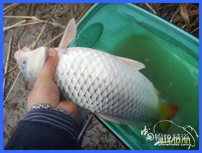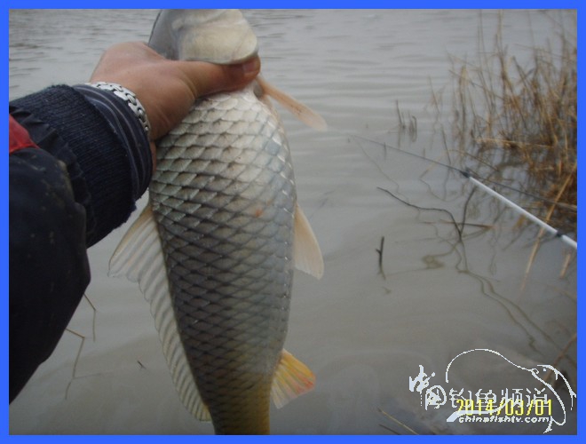 扬竿挂底了,用力举起竿向上抬,水底物徐徐上升,心想肯定是挂到水底布条了吧,还在庆幸没挂死,能拉上来,没想到一出水面看到一个大鱼嘴,马上 弓起竿,鱼整个翻身才看到是条鲤鱼,到水面才开始挣扎。上面有树枝,不好溜鱼,还好鱼没多大力气,慢慢牵到旁边,这时却开始大力挣扎,小心溜翻后拉到脚边 上,直接用手抓上来。一条大鲤鱼,目测二斤左右。