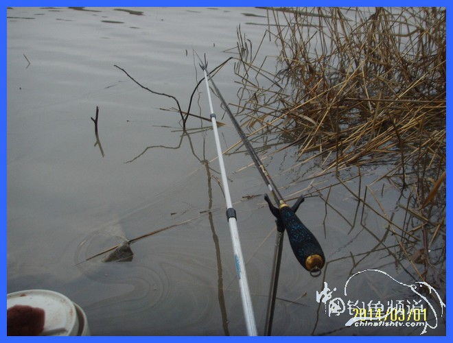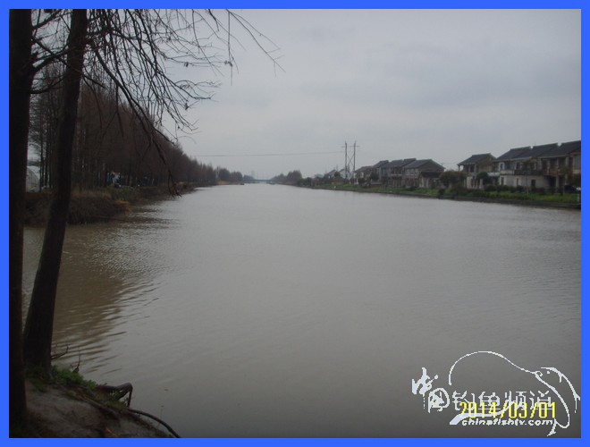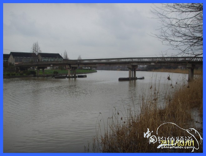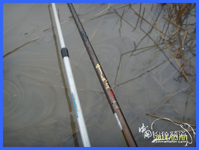 等待的时间是漫长的,一直等到四点,潮水还是没有退,先来的那家伙看看天也不早了,再钓也没意思了,还下着不小的雨,我看他就拿了一把普通的雨伞, 可能不好操作,回家去了。全河就剩我一人。我仔细看一下,潮水虽没有退,但是,水位有下降,水流很缓,估计水闸提前关了,水没流出,所以水位还是高,但是 估计已经能下钩了,于是,我就放下钓箱,在最靠边已退水的地方支好,3.6米的竿,能钓到芦苇丛向外伸80公分的地方,水深还是有近3米。下午转西北风 了,抛竿有点难,不过还行。