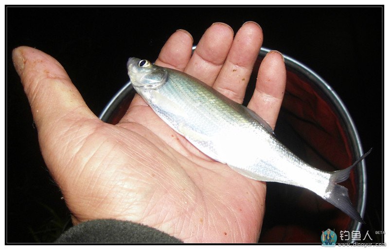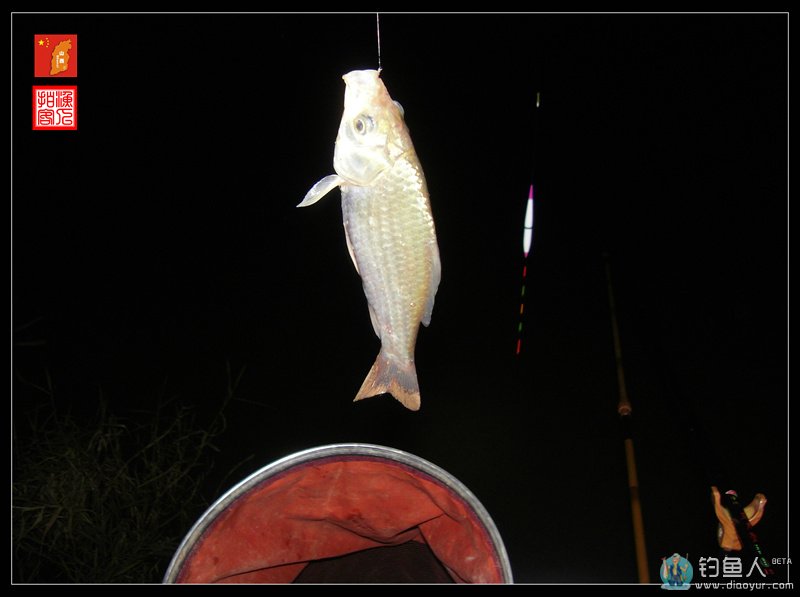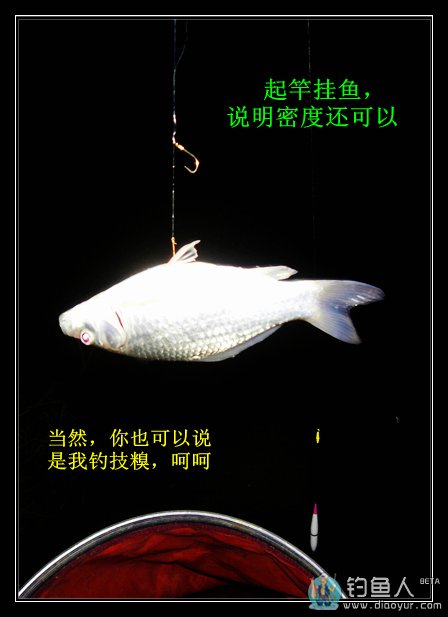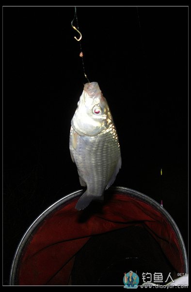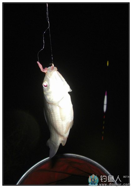 我的第一尾渔获是抬竿时挂起来的,这样的现象在天黑换漂前连续出现了三次,可见我的窝子里有鱼,就是线组和鱼漂不匹配导致了信号不灵。