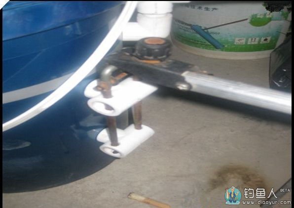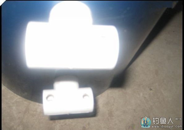 鱼护架部分:鱼护架稍微复杂一点,四分三通,中间管路后面打一通孔,直径能放鱼护杆就行。旁边两个管路,一路加木塞与桶固定,另一路加一螺母配一螺丝,用于锁紧鱼护杆。如图: