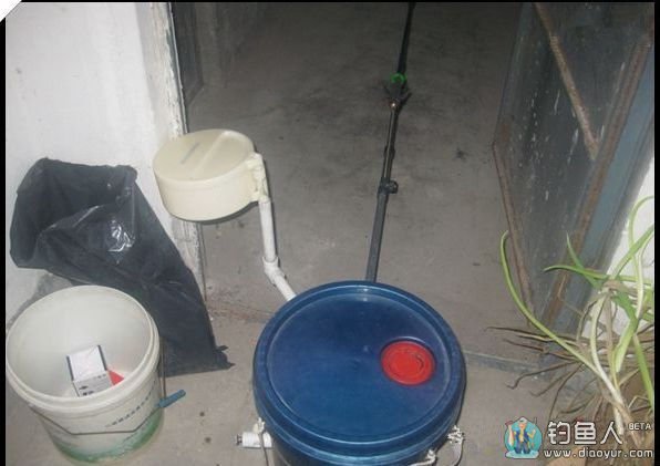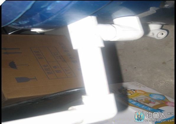 再介绍一下饵盒支架部分:四分三通1件,弯头2件,用PPR管连接在一起,如图所示。背面安装木塞,与桶相连方法同上,此结构能保证强度。