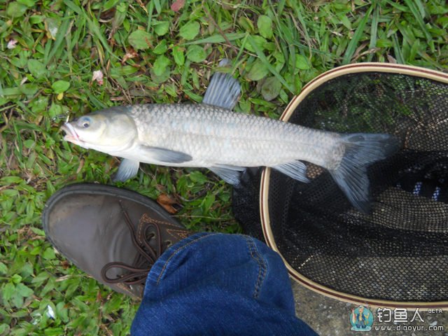 果不其然,抛了约五竿后,突然一个下拉的力量把竿头弯成半圆,在我还没意会到什么事时,鱼开始狂冲,卷线器上的出线声响了起来,后面散步的路人围了过来观 看,一直在猜我钓到什么鱼了,但我拉了许久,鱼就是不浮头,而我的子线只有1.2号,我怕断线所以让鱼持续冲,不一会儿它慢了下来,在水表下闪出银白鱼身 及鱼尾,乍看我还以为是乌鱼,鱼拉到岸边时,我的手捞网已抽了出来,这时后面的老伯已脱口说是个青鱼啊!