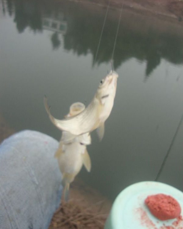 劲酒虽好,不能贪杯,2两下肚,已感全身发热,嘎嘎咬一块,抛一竿哟,钓回醉鱼如何。小插曲来了,着实把我们都激动了一番。饵料到底两分钟左右没动 静,准备换饵,浮漂轻微的下顿了一目,下意识的提竿。已成弯弓,好沉啊,挂底?线在动,我才反应过来,中莽子了,摆摆没有怎么发力,只是慢慢向岸边靠拢, 水下冒起一串串水泡,应该是个鲤鱼MM。