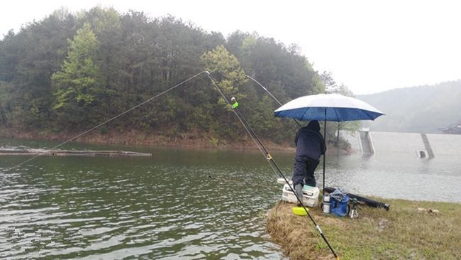 但 真正让人无奈的是天气的剧变带来的鱼情不好,四处的水迅速向水库汇集,一天涨水半米左右,我们的钓位更是不断转移,短杆基本没口,倒是长杆偶尔给个意外, 给口的全是鲤鱼。百丈崖的1号线很是顺利的钓上了7.8斤鲤鱼,金版的粗线却断的无奈,最后竟然杆子第一节也断了,鱼的大小也无法知晓,三天一行四车十多 人基本能坚持在水边的,也寥寥无几,更多是在农家舒服的品新茶,赏美景,因为雨实在很让人无奈,真实的寒冷无处不在。或许顺势而为,努力而做也是在逆境中 最好的坚持。