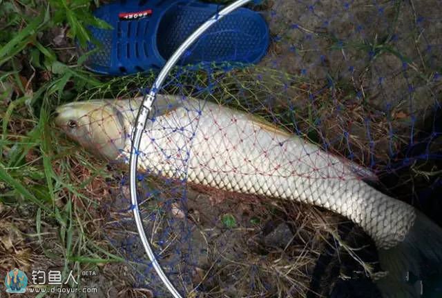 转眼一个多小时过去了,又一个黑漂,提竿时发现不能将它拖出水,赶紧起身双手握竿加大了提竿的力度。随着鱼儿的挣扎越来越大,拉的风线呼呼的响,几次有力的冲刺都被我一一化解,约3分钟后一条目测六斤左右的草鱼被我遛翻拖至岸边,顺利抄网入户一阵心喜。