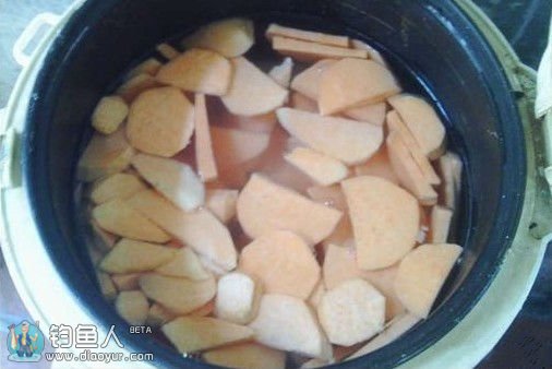 红心地瓜去皮洗净,切成薄薄的片状,放入电饭煲内(适当的加一点冰糖或红糖)ps:煮完地瓜的水不要倒掉