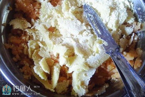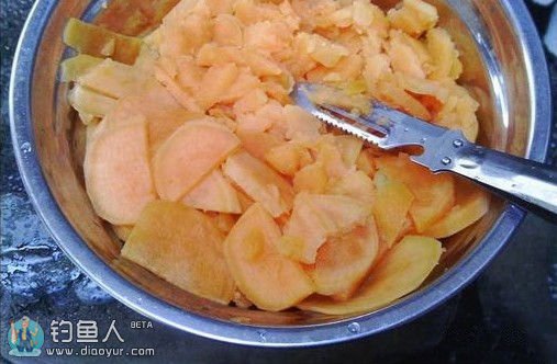 将玉米窝头削入已搅碎成浆状的地瓜盘中