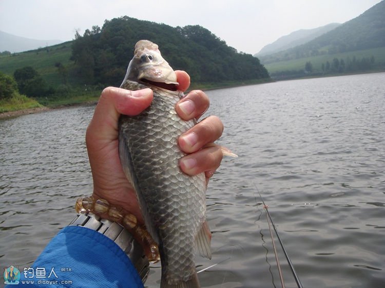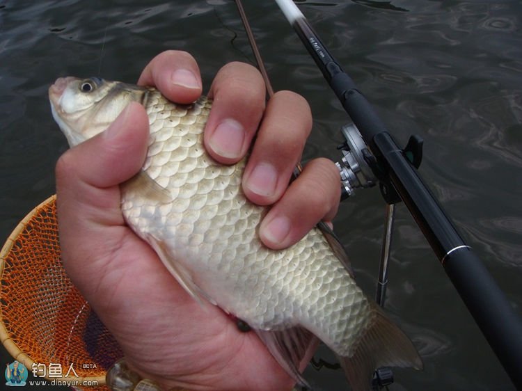 接着左手边老刘9号伊势尼大钩,2号子线,上午连上8条大鲫鱼,小的半斤,大的1斤,漂亮,看得我眼巴巴的。10:20,我也上来一条,看看吧,照片,比例尺,就是这么大的野鲫鱼,原库的,山泉水里长大的,这皮毛,这眼神,神气,带劲。