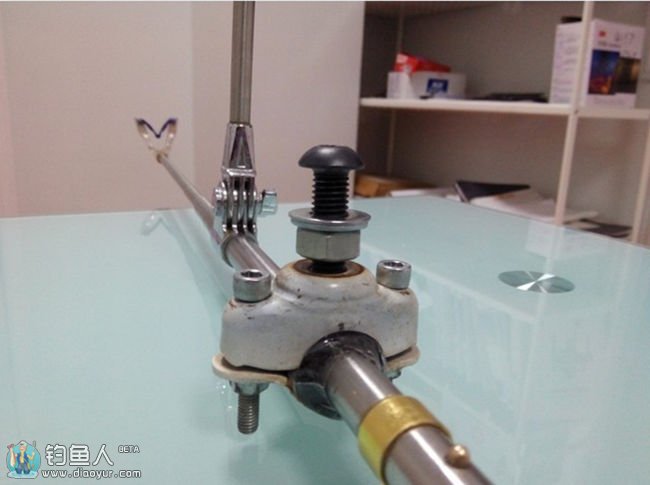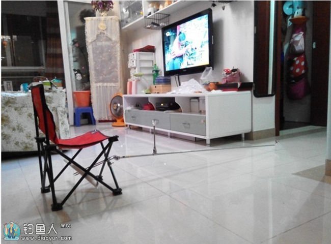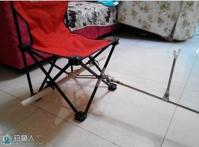 看着上下晃动的“獠牙”,我又开始想入非非了,怎样才能让它安静一下呢?一不留神,我看见了钓椅左右两边的椅脚十字形,两只眼睛不由得一亮,一根“烧火棍”横空出世,一棒打在了“獠牙”的尖部位置,从此这个妖怪就再也翻不过身了,变得服服帖帖的了,从此我的钓竿再也没有偏离航道了。呵呵!这个“从此”到现在,也就不过才过三天时间而已!看着我这样的作品,我两眼愈发的亮了,这样的开心真的很好。