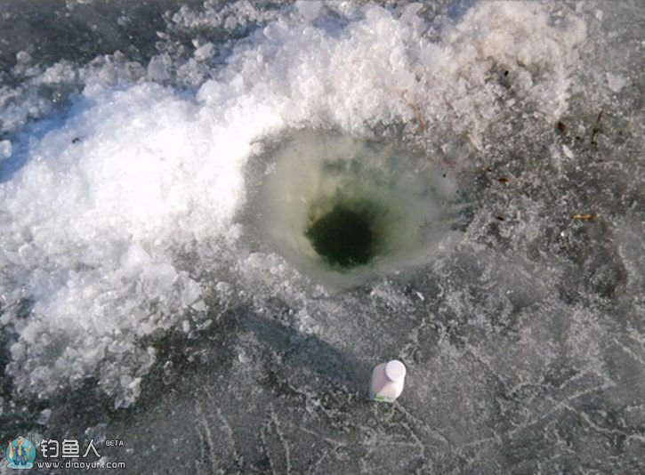 这个是打好的冰眼,碎冰要放到一面,防止挂线。冰钓要找鱼,找鱼就要打很多个冰眼,我放个瓶子目的是做记号,大多数人用小红旗。
