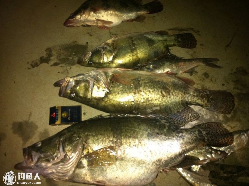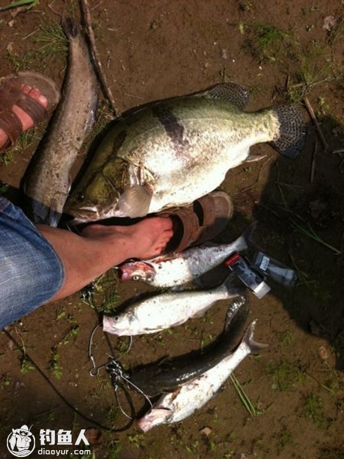 第二天早上5点我们来到标点继续寻觅巨鳜的踪迹,冰哥一个人又走到河边昨天上鳜鱼的标点,没几分钟就听见他喊中大鳜鱼了,我们两人连忙跑去帮忙,大鳜鱼俘虏上岸后,测量长度72cm,重量11.2斤。其后继续不断的中鲶鱼,乌眼,黑鱼各几尾,拉的手都软了。直至早上8点以后,攻击愈发减少,收杆返回。