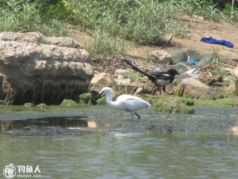 在吃水里的小鱼小虾 旁边还有一只臭喜鹊在喝水