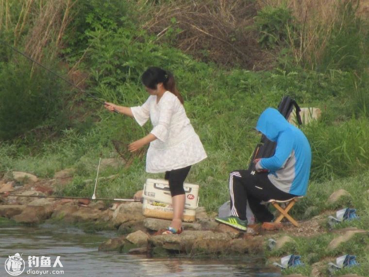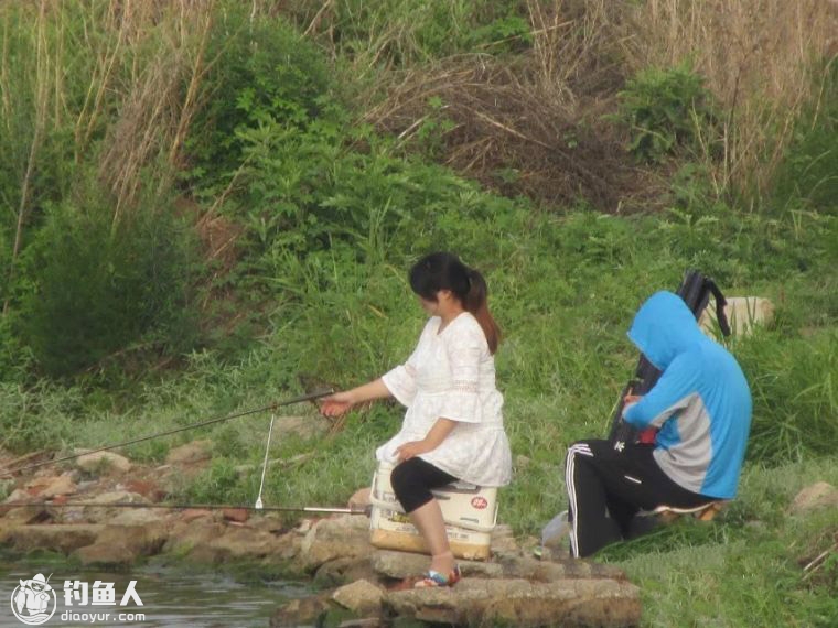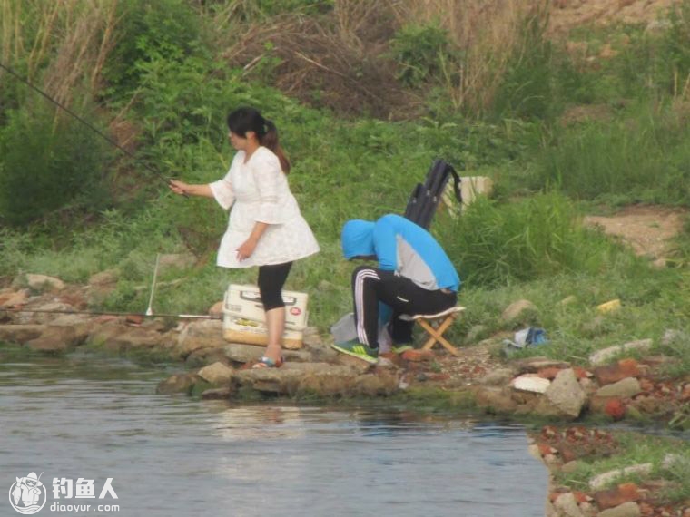 背后不知道什么时候来了小两口在钓鱼离的有点远啊