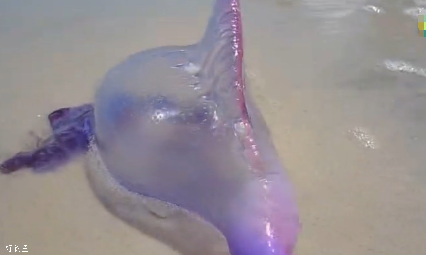 仔细辨认后才认出这种生物叫僧帽海母,为暖水种是一种管水母,在水面上漂浮的淡蓝色透明囊状浮囊体,前端尖、后端钝圆,顶端耸起呈背峰状,形状颇似出家修行僧侣的帽子,故取名僧帽.