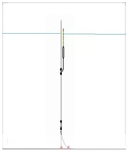 举个例子,你的浮标吃铅为2克,你半水空钩调成四目,假设浮标的剩余浮力还有1克,而你的双饵重为2克,这时候你在双钩半水状态挂上双饵抛竿入水,肯定浮标会没入水中,有的朋友这时候就开始上移浮标了,到露出二目,这个时候双钩是什么状态呢,双钩带饵到底,因为浮标的剩余浮力根本牵不动双饵,所以双饵的状态都是直接到底的。何来的一钩到底,一钩轻触底的状态?下图是不灵不钝状态时的双钩状态图。