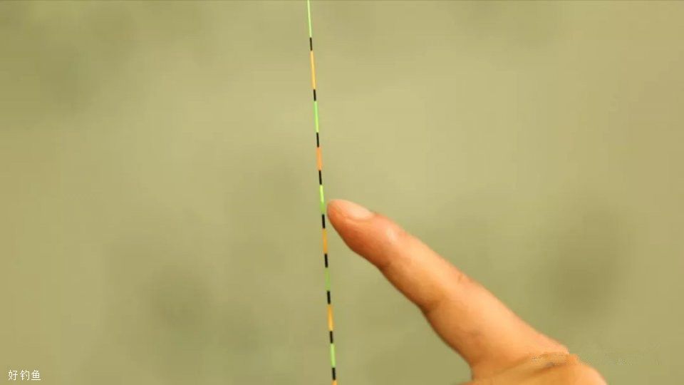 第四步:确保浮标半水带双饵调成一目后,缓慢上移浮标,到浮标露出一目,或一目半,或二目,都可以,这个根据个人的看标习惯,这时候水底双钩的状态基本就是一钩带饵轻触底,一钩带饵到底躺倒的状态。